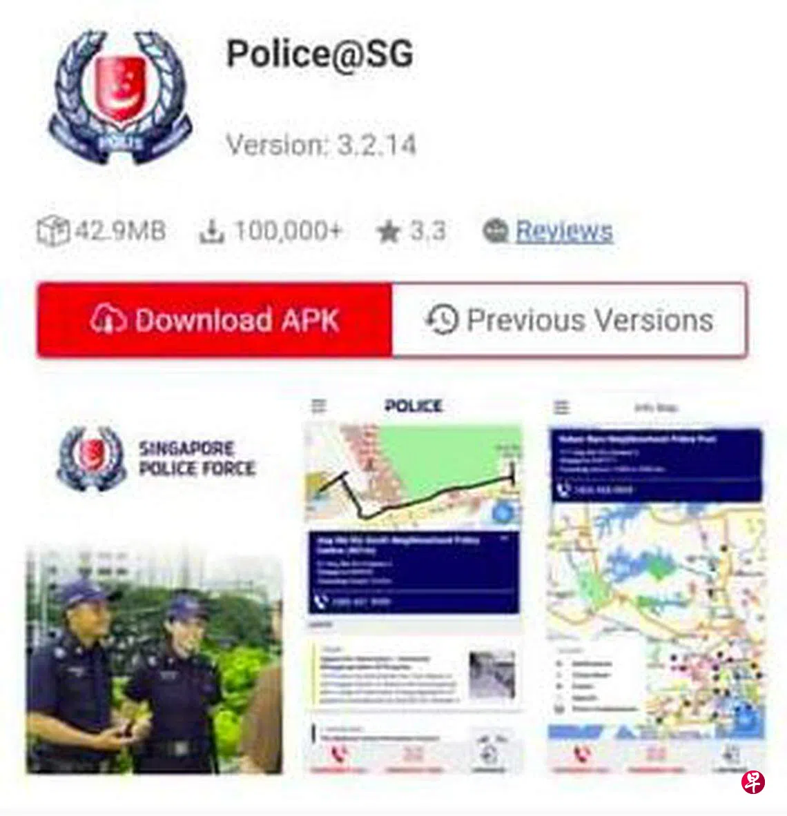 新加坡警察部队星期五(5月19日)晚上8点50分左右在脸书页面上指出,警方已知晓第三方网站出现假冒Police@SG的手机应用,并提醒公众警方的Police@SG手机应用,只能从官方网站如谷歌应用商店(Google Play Store)和苹果应用商店(Apple App Store)下载。