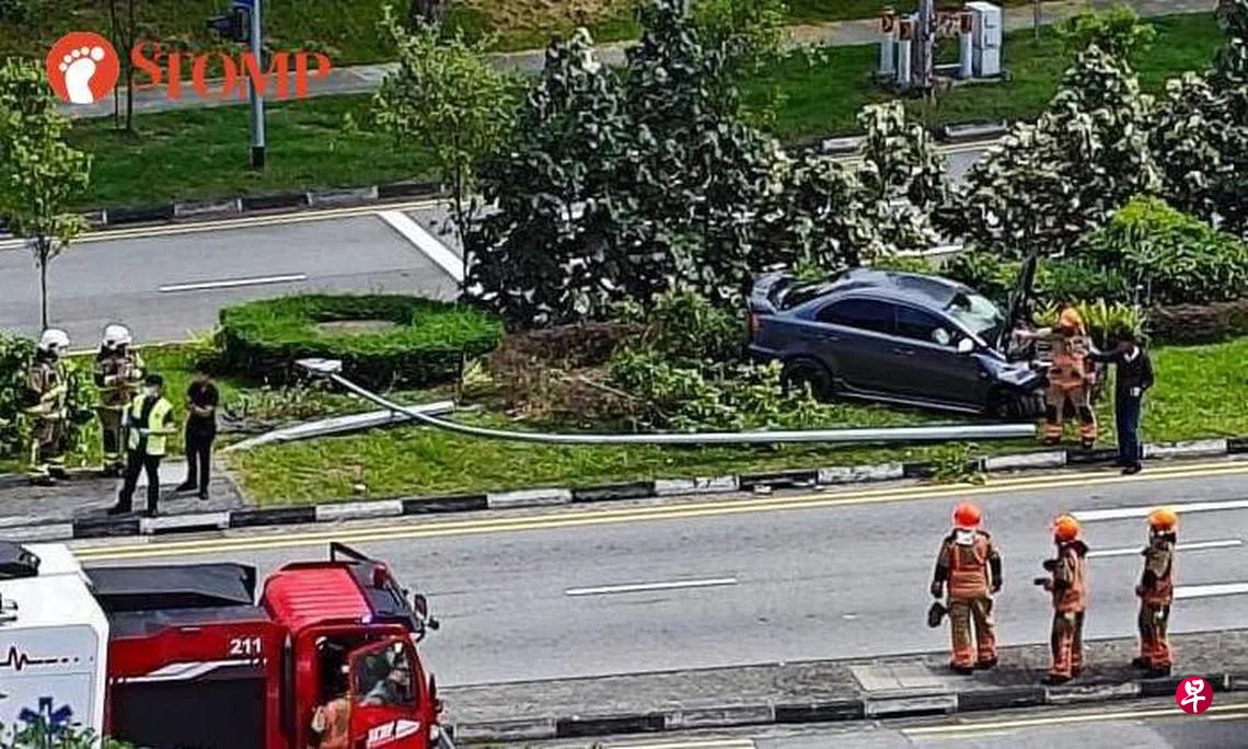 网民特蕾莎发了现场照片给STOMP,画面显示一辆轿车失控冲上道路旁的草坪,损毁不堪,旁边还有一个灯柱倒在草地上。