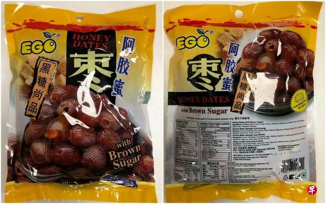 新加坡食品局星期五(6月2日)发文告说,在EGO蜜枣中检测出未经申报的二氧化硫(sulphur dioxide)超标,对亚硫酸盐(sulfites)严重过敏的人在过度服用后可能出现荨麻疹、瘙痒、胃痛、腹泻和呕吐等症状。