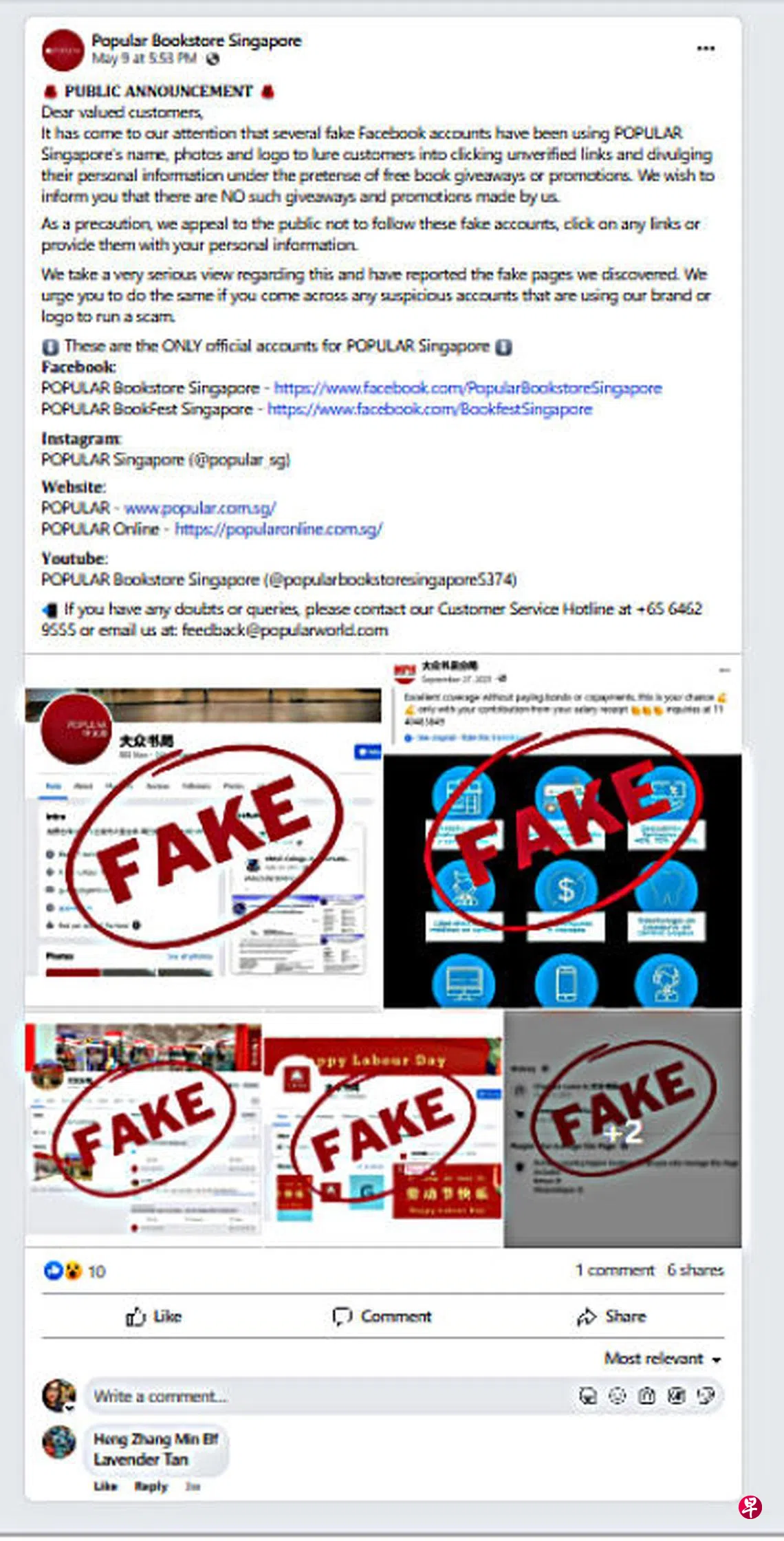针对骗局,新加坡的大众书局官方脸书在5月9日发文,提醒公众切勿上当受骗。
