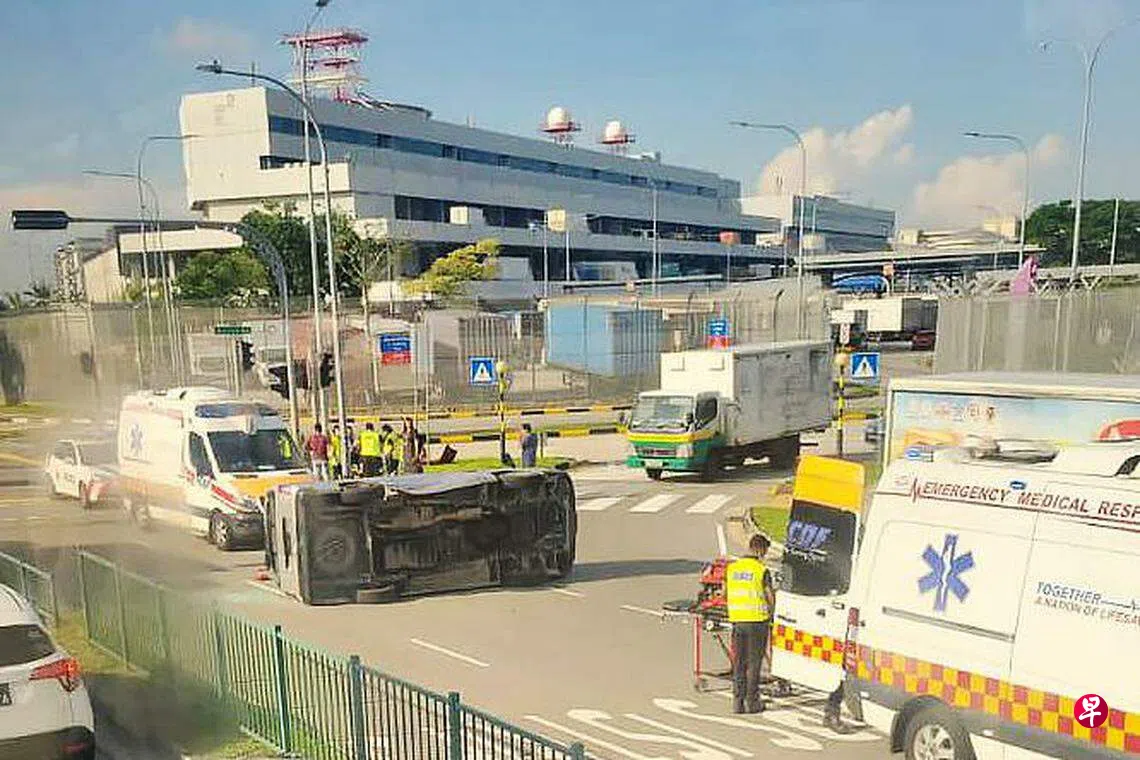 《联合早报》读者提供的照片显示,一辆银色货车侧翻在交通灯前,货车的侧面因撞击而凹陷,不远处则停了两辆救护车和一辆警车,现场也可看见多名民防人员展开救援。