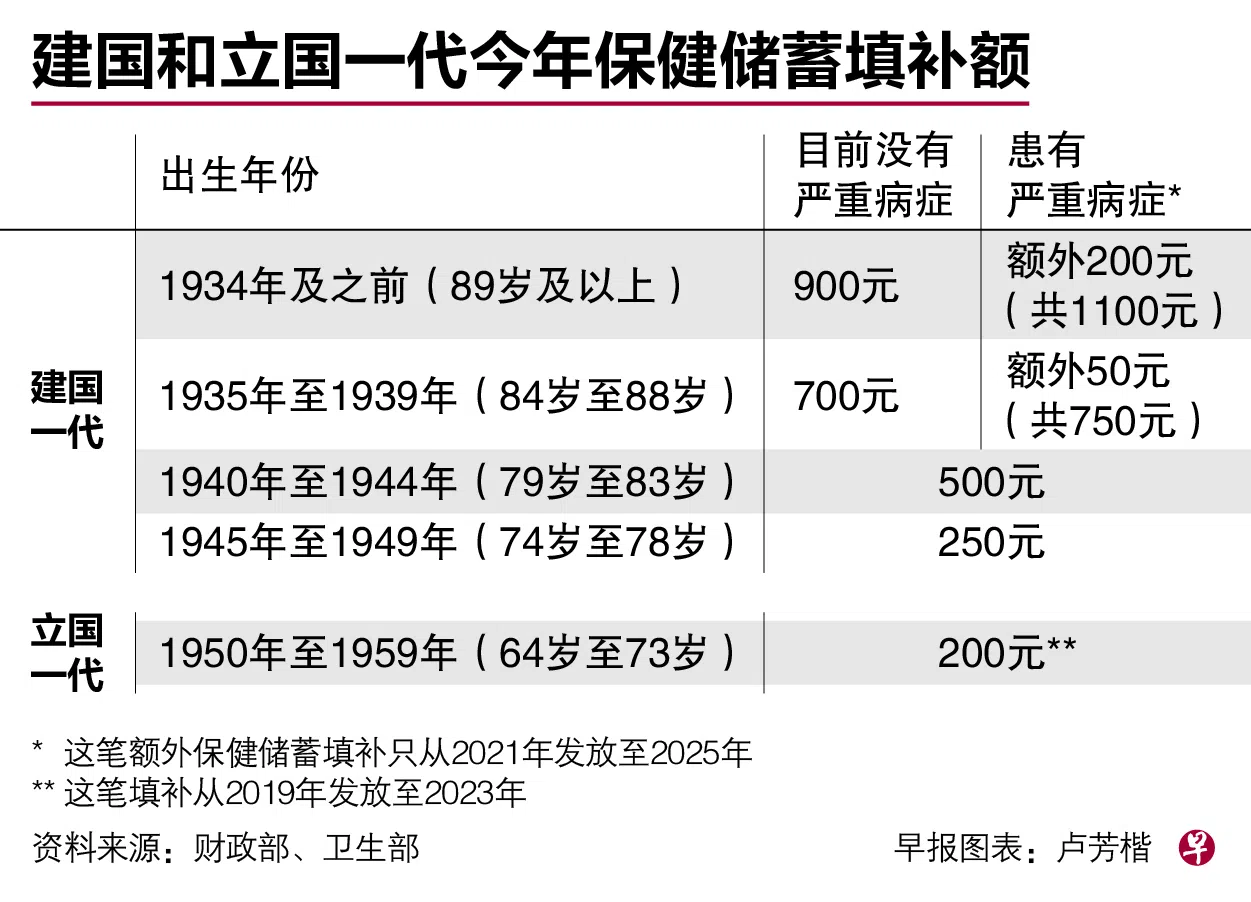 财政部和卫生部星期五(6月9日)发布文告说,今年满89岁或以上者可得900元;84岁至88岁得700元;79岁到83岁得500元;74岁至78岁得250元。建国一代可终身享有此填补。