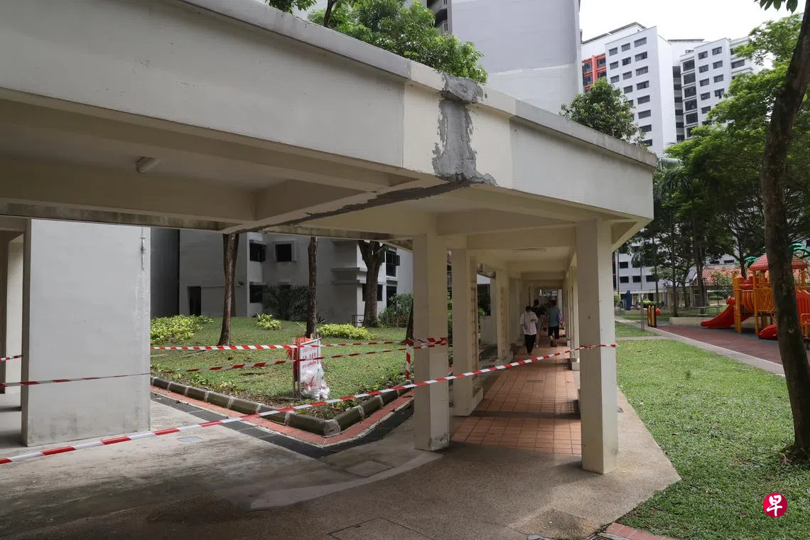 盛港组屋走廊顶端外侧,重达五公斤的石灰块剥落坠下,令附近居民担忧。
