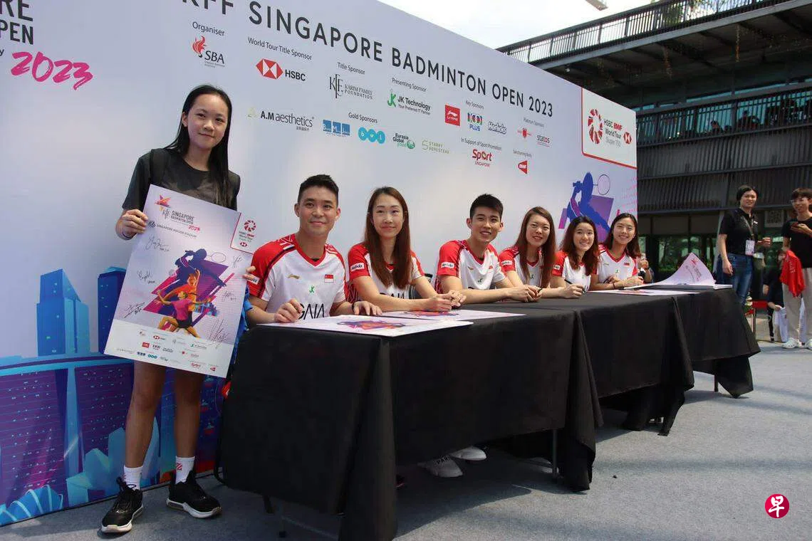 新加坡六名羽毛球员骆建佑、杨佳敏、许永凯、陈薇涵、金羽佳和黄嘉盈星期六(6月10日)中午12时在新加坡体育城举行见面会,为现场大约100名球迷签名、合影。