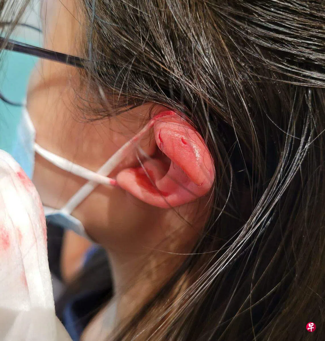 根据陈玲丽提供的照片,女儿的左耳轮上方被啄出好几个伤口。她说,由于耳朵软骨多,女儿当下没有感觉特别疼痛,全程表现相当冷静,因此没有引起骚动。