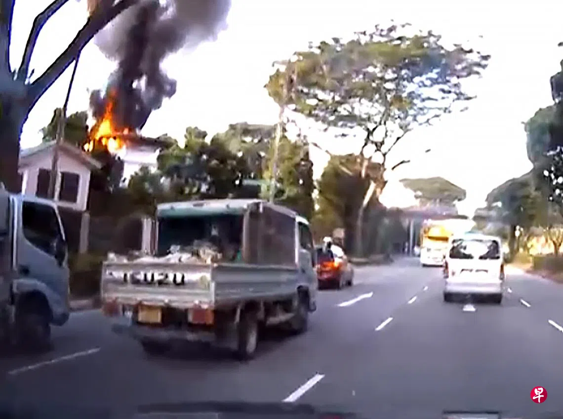 根据读者所提供的视频,涉事洋房的屋顶冒出滚滚浓烟,火苗也不断往上窜。