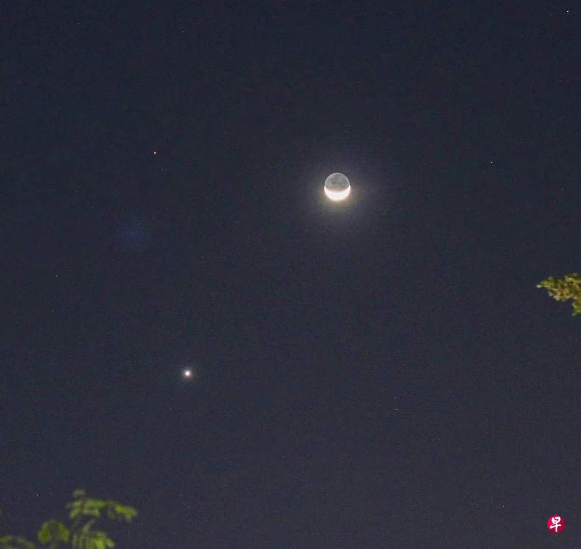 新加坡西部夜空出现火星、金星与月亮“双星伴月”的美丽天象。
