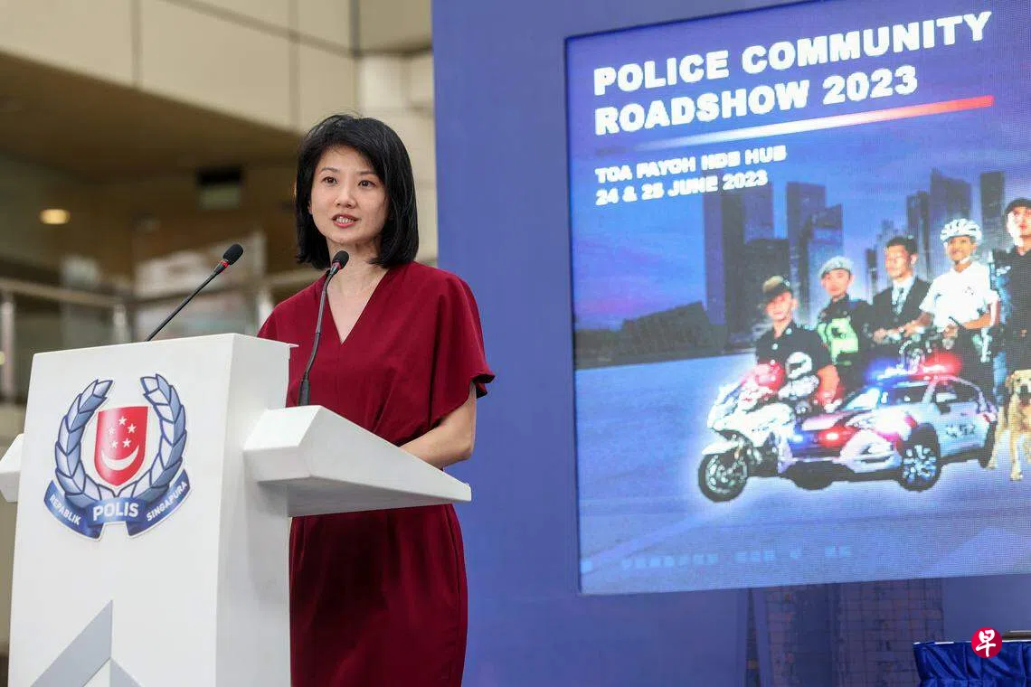 新加坡警察部队星期六(6月24日)在大巴窑建屋发展局中心举办第二场警方社区路演(Police Community Roadshow)上,为“学生反诈骗大使”比赛的前三名获奖团队颁奖。