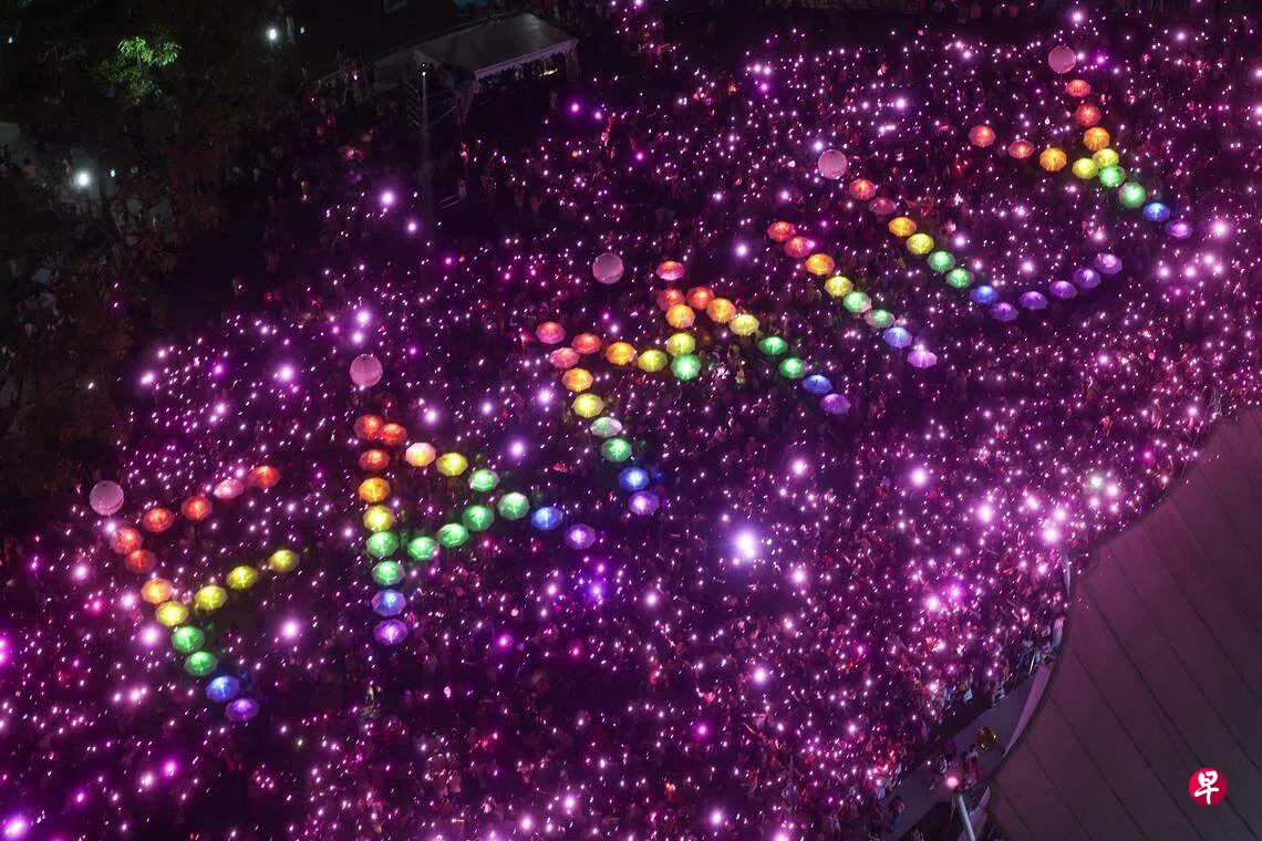 一年一度的“新加坡粉红点”集会,星期六(6月24日)在芳林公园演说者角落举行。入夜后,出席集会的参与者在主办方的呼吁下,纷纷取出携带到场的手电筒,照耀出粉红色和彩虹色的灯海拼出“家人”的英文字样。