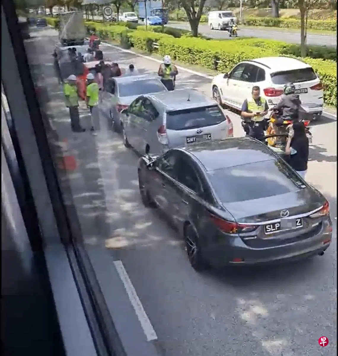 黄先生(28岁,IT行业)告诉记者,当时他坐巴士上班,靠近该路段时就开始出现车龙,经过事发地点后才知道发生了车祸。他指出,车祸涉及五辆轿车,现场有几位警察和陆交局人员指挥交通。根据黄先生提供的视频,现场车辆移动缓慢,警员在向涉事车主们了解情况,受影响的第二车道也被封锁。