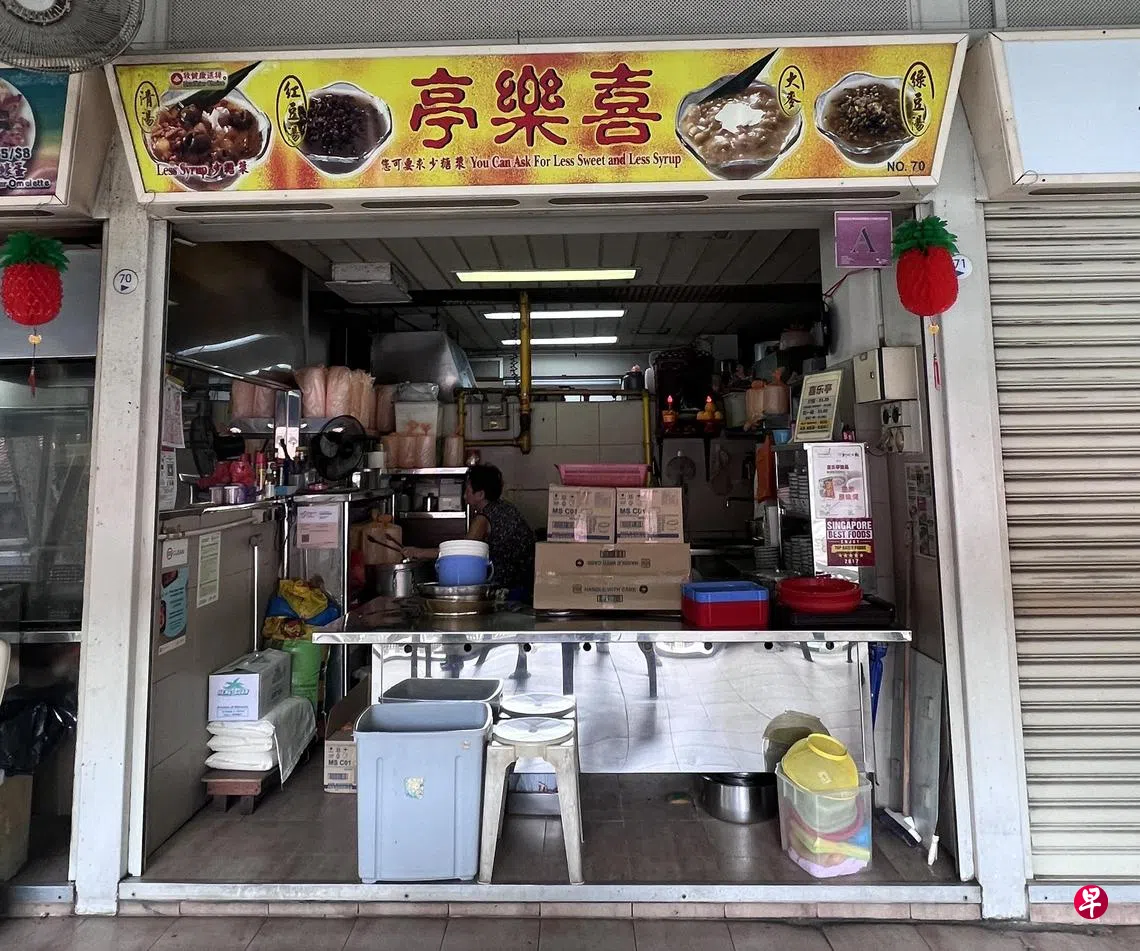 位于女皇镇联邦弯第31座巴刹与小贩中心二楼的“喜乐亭甜品”,有超过50年的历史,虽然只卖四样甜品:清汤、大麦粥、红豆汤与绿豆汤,但摊位外总是大排长龙。