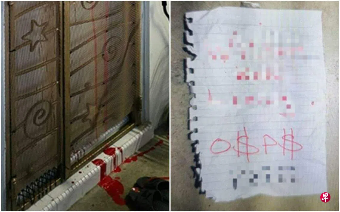 新加坡警察部队星期一(7月17日)发文告表示,警方于上星期日(16日)接获通报,指位于巴西立第6通道的一个住宅单位,铁门遭人泼红漆,还留下大耳窿的讨债字条。