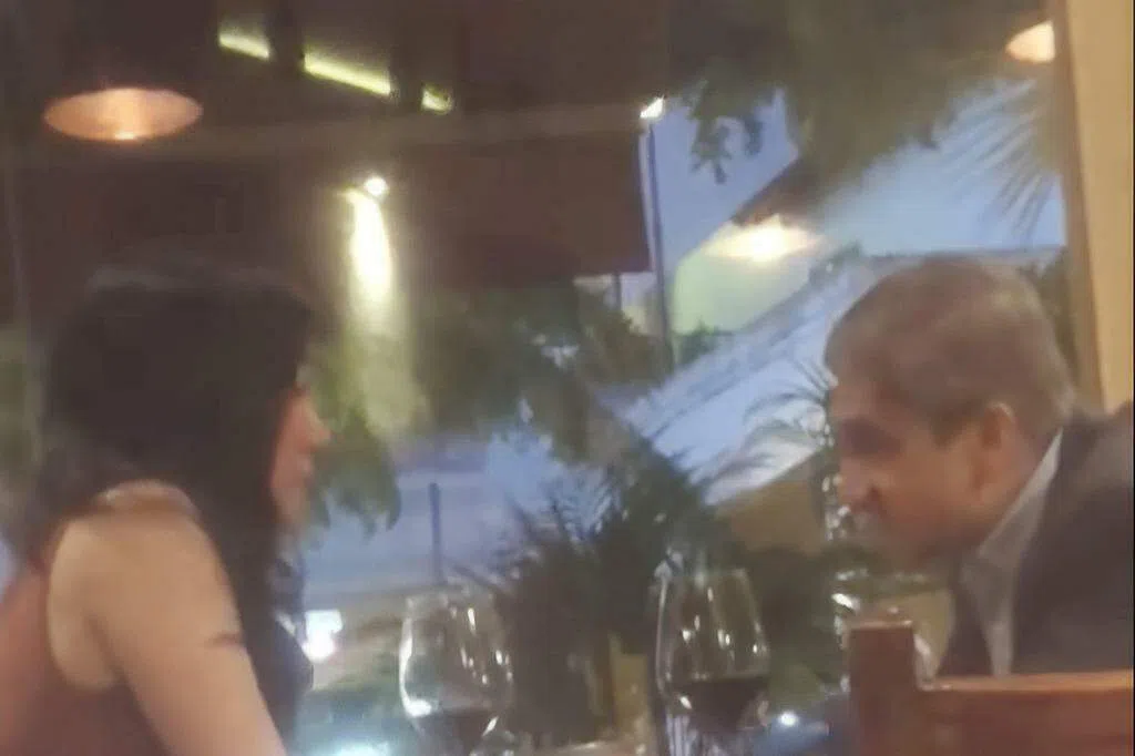 根据网上流传的视频,贝理安(53岁)和佘雪玲(37岁)当时在餐厅内交谈,前者还抚摸后者的手。