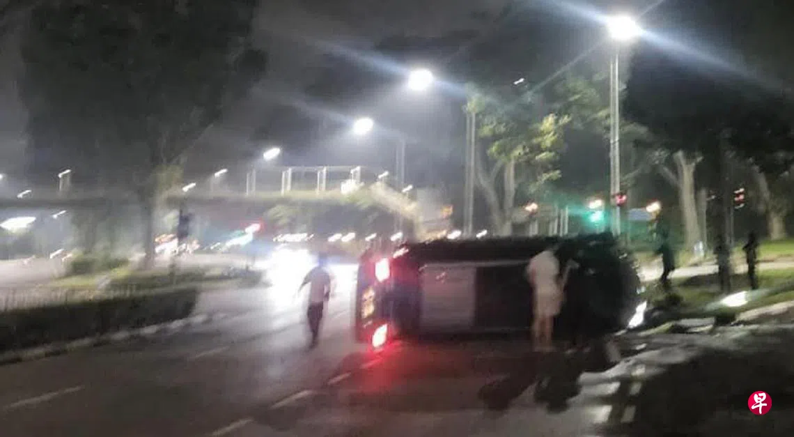 根据脸书专页“Sg Road Vigilante”星期六所发的图片,一辆车在行人道旁侧翻,一名身穿白色衣服的男子爬上车门,旁边还有三名路人趋前看个究竟,相信他们正在查看车内人士的情况。