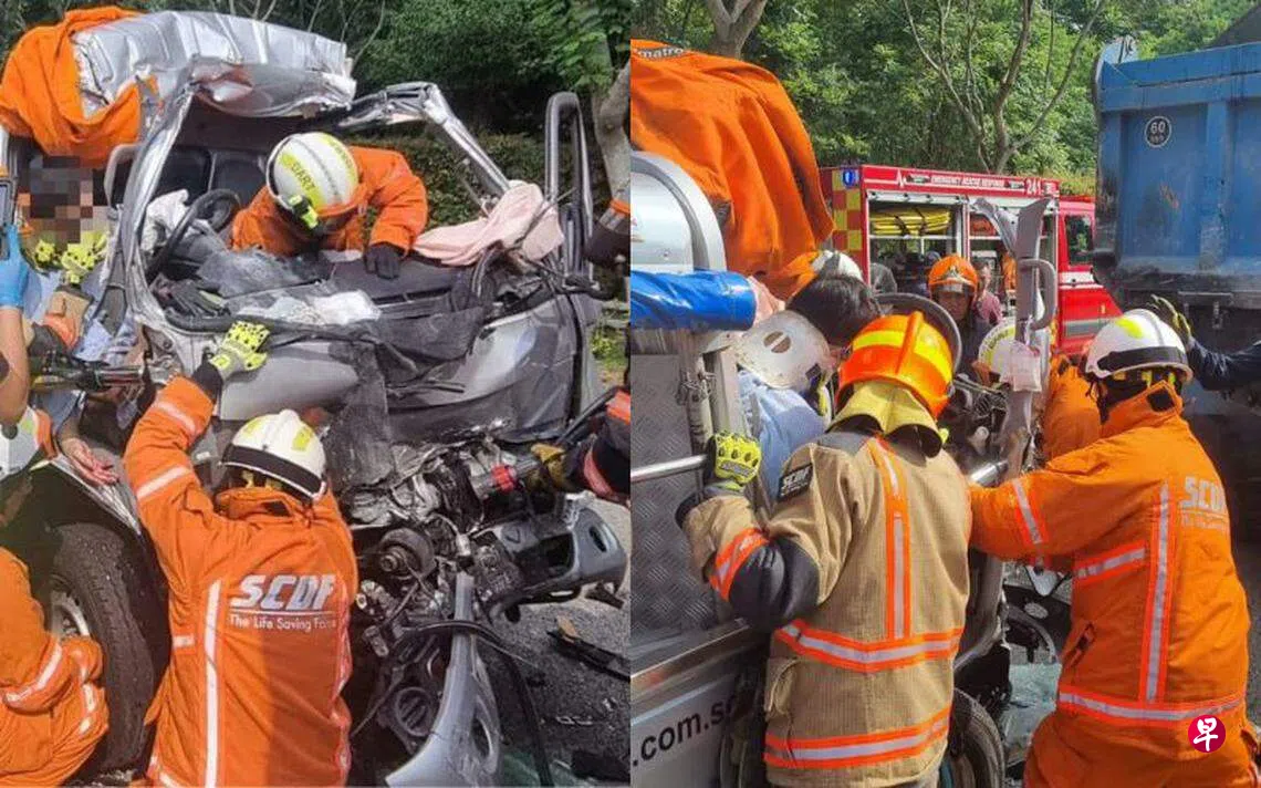 一辆罗厘和卡车相撞,猛烈的撞击力导致卡车的车头严重损毁,卡车司机被困在驾驶座上,民防人员须切开夹住男子左脚的离合器踏板才把男子救出。