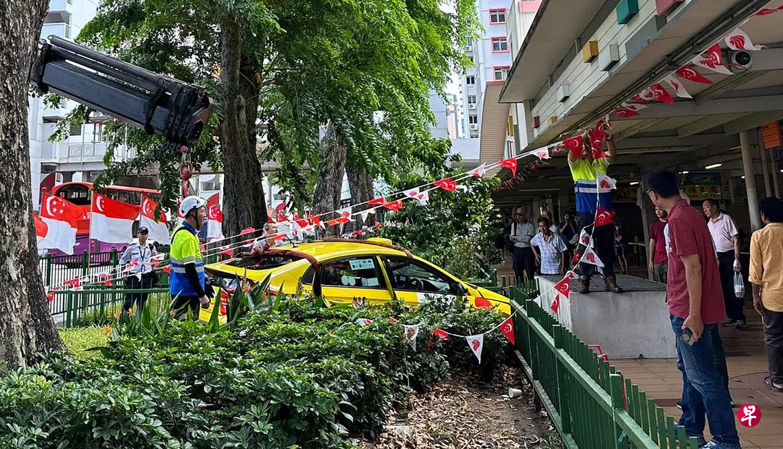 与切入车道的车辆发生碰撞,德士失控冲上路边草坪,撞上铁围栏才停下,差点冲入熟食中心,德士司机受伤入院。