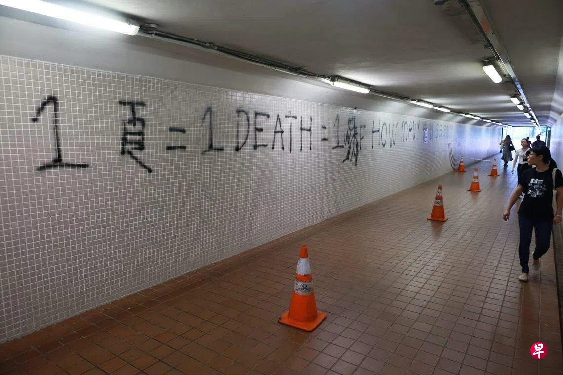 星期二(8月8日)上午,波那维斯达地铁站的地下道墙壁,被涂鸦者使用喷漆,在墙上留下一行英文大字If 1 syringe = 1 death = 1 hanged man HOW MANY 4 U SG GOV?”,一旁也画了注射器,以及一个抓着“$”符号的绞刑者图案。