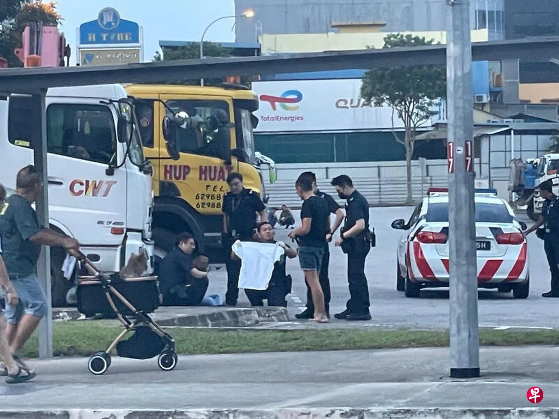 《新明日报》热心读者发来照片的显示,一名男子坐在重型车辆停车场,现场有数辆警车和多名警员,也能看到一件沾到血迹的衣服。该男子之后被戴上手铐带上警车。当时一名女子也正在接受警方问话。