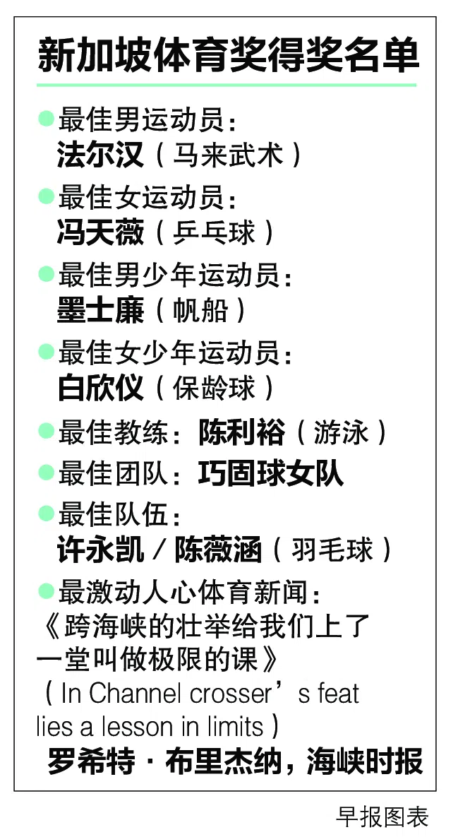 新加坡体育奖颁奖礼星期三(8月23日)在乌节大酒店举行,我国乒乓女将冯天薇职业生涯第四次夺得年度最佳女运动员,最佳男运动员归马来武术的法尔汉。