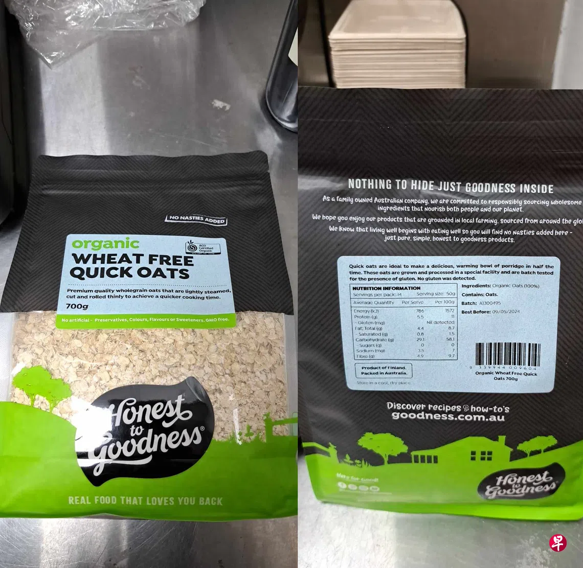 包装上称产品不含麸质过敏原,却在检测中查出含有这种过敏原,新加坡食品局召回从芬兰进口的Honest to Goodness’ 有机无小麦速食燕麦(Organic Wheat Free Quick Oats )。