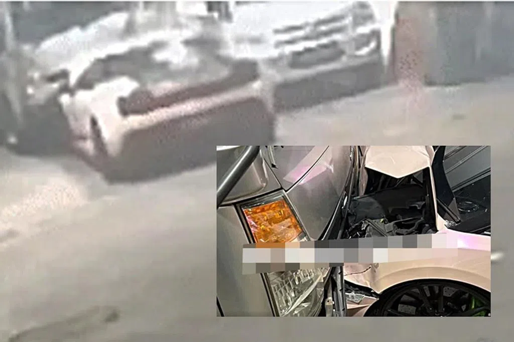 跑车和德士相撞,跑车车头和车尾都毁不成形,零件洒落一地,跑车驾驶者安然无恙,德士司机却受伤送院。