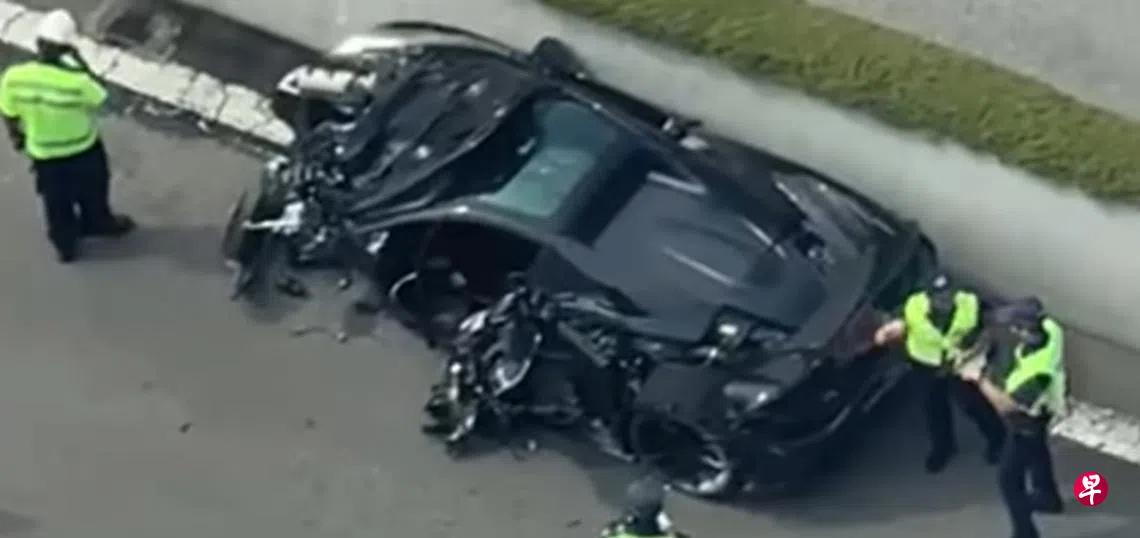 黑色跑车停在距离德士好几米远的车道,整辆车已经撞得毁不成形,引擎盖翘起,左边的车门也完全撞毁,车尾变形,甚至车轮都飞到路上。