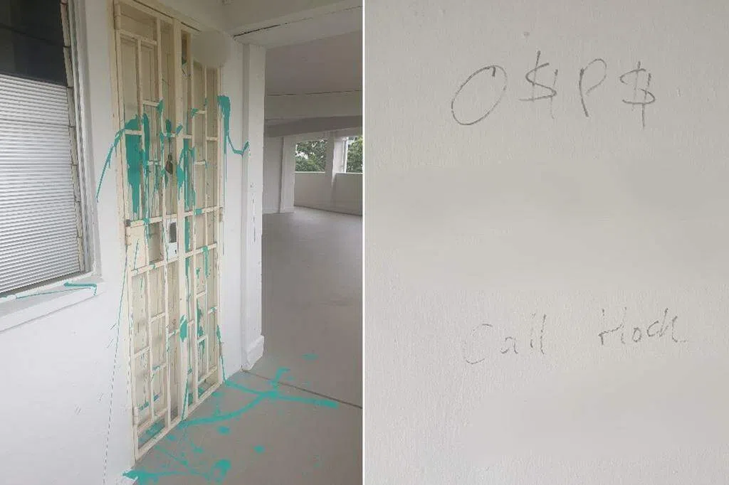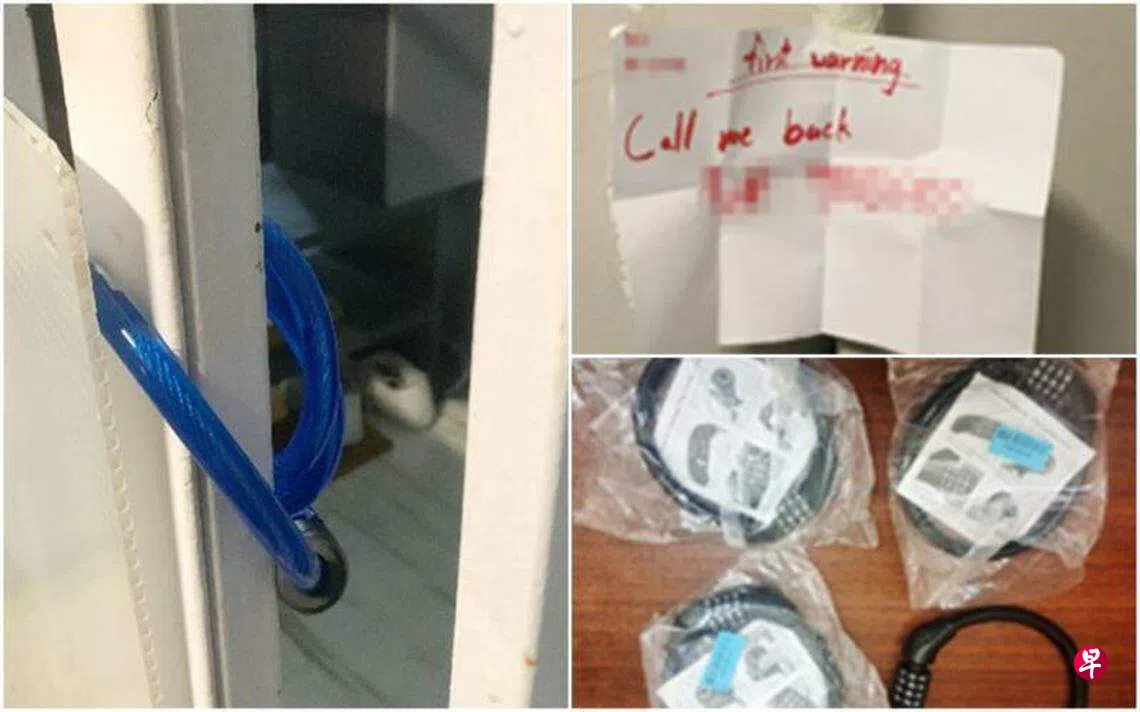 新加坡警察部队星期三(8月30日)发文告指,警方于上星期六(26日)接获通报,指勿洛北4道一个住宅单位的铁门被人用脚踏车锁链锁上,单位外的水管贴上大耳窿的讨债字条。