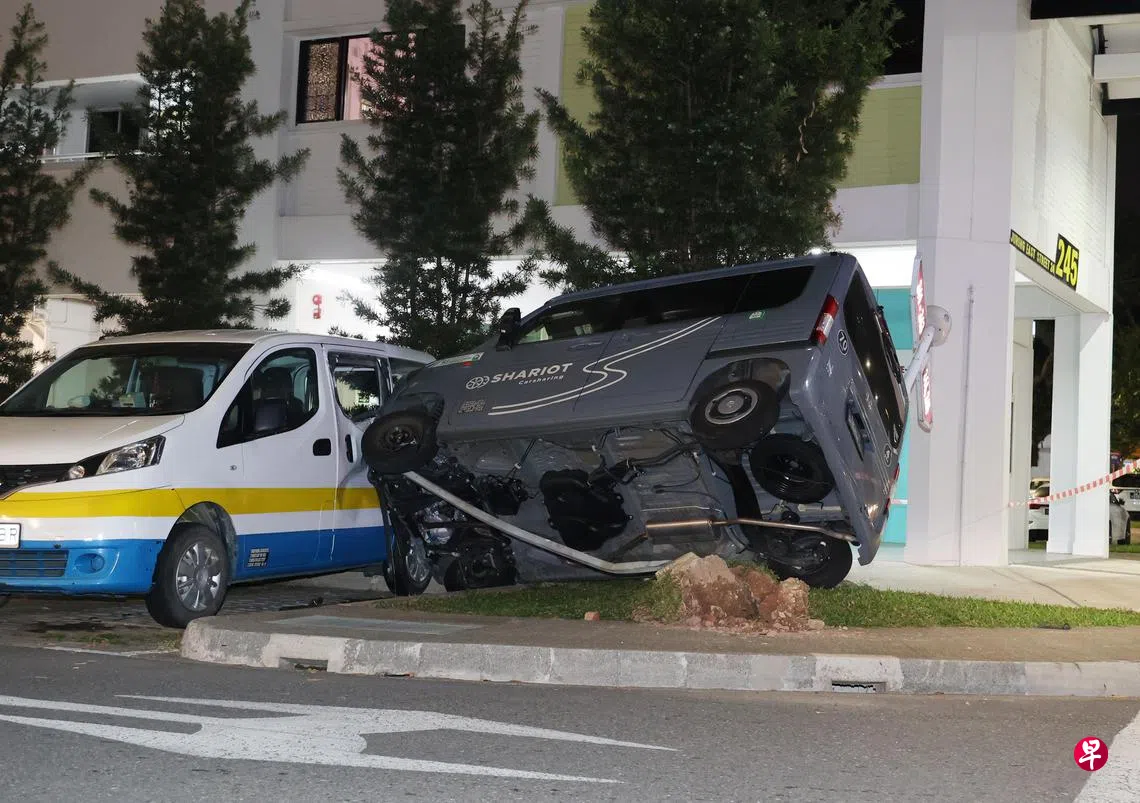 这起车祸发生在星期五(9月1日)晚上10时30分,地点是裕廊东24街第245座组屋的户外停车场。一辆共享车辆失控,冲上路堤,撞倒路牌。