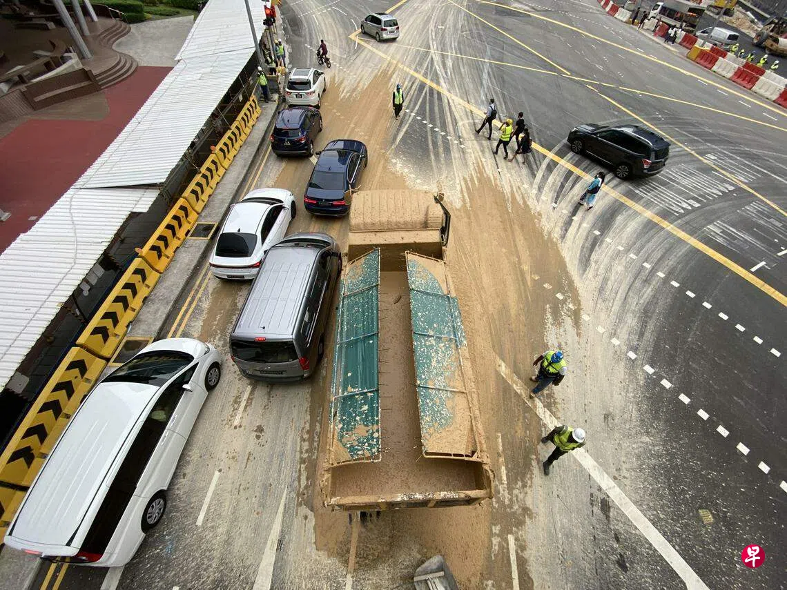 自卸卡车把泥沙撒满路面,交通一度受阻,当局清理完毕后已重开路段。
