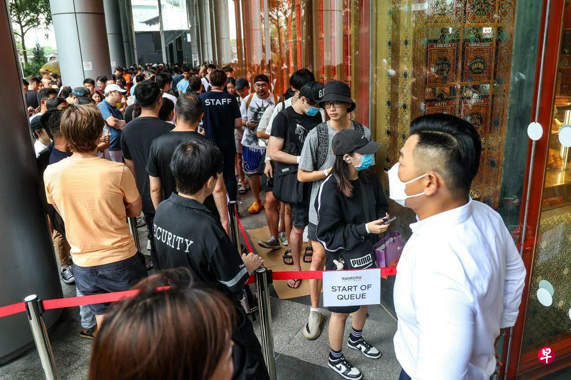 这款联名表在星期六(9日)全球首发,新加坡爱雍乌节(ION Orchard)和滨海湾金沙商场的斯沃琪门店从早上10时开始发售,限定每人只能买一只。