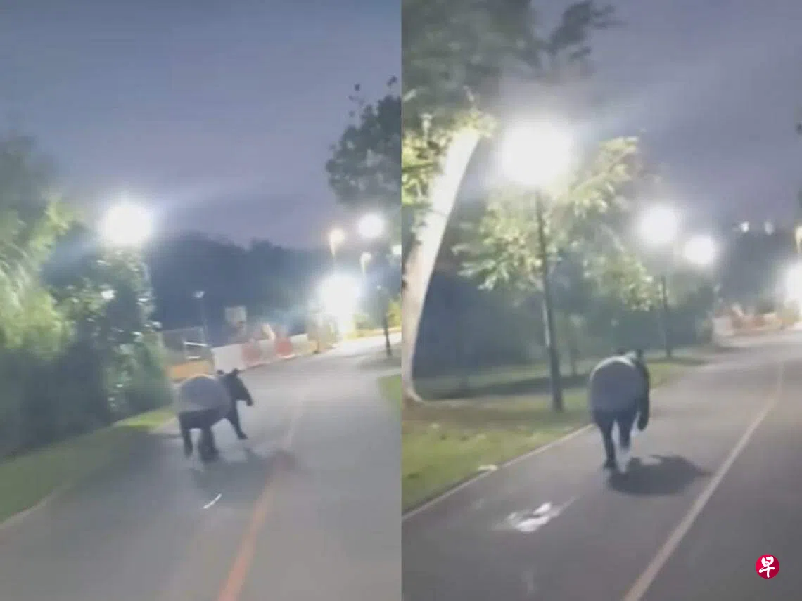 脚踏车骑士清晨骑车听到身后传来“马蹄声”,结果竟是罕见的马来貘,再次出没榜鹅公园连道。