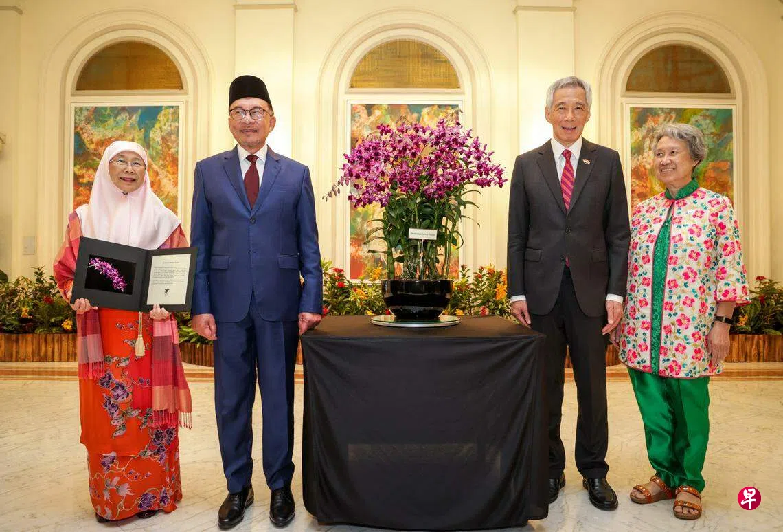 马来西亚首相安华(左二)9月13日将来新出席米尔肯研究所亚洲峰会。图为2023年1月30日,安华对新加坡展开正式访问。他和夫人旺阿兹莎(左一)在总统府出席胡姬花命名仪式。李显龙总理(右二)和夫人何晶(右一)一同见证命名仪式。 (档案照片)