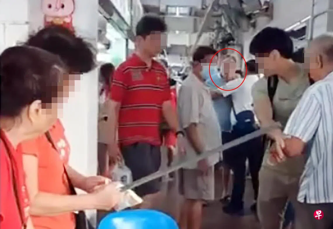 同时,还有一名穿着白色、带着蓝线条上衣的阿叔,也试图想要帮助阿嬷,同样被年轻男子阻止。