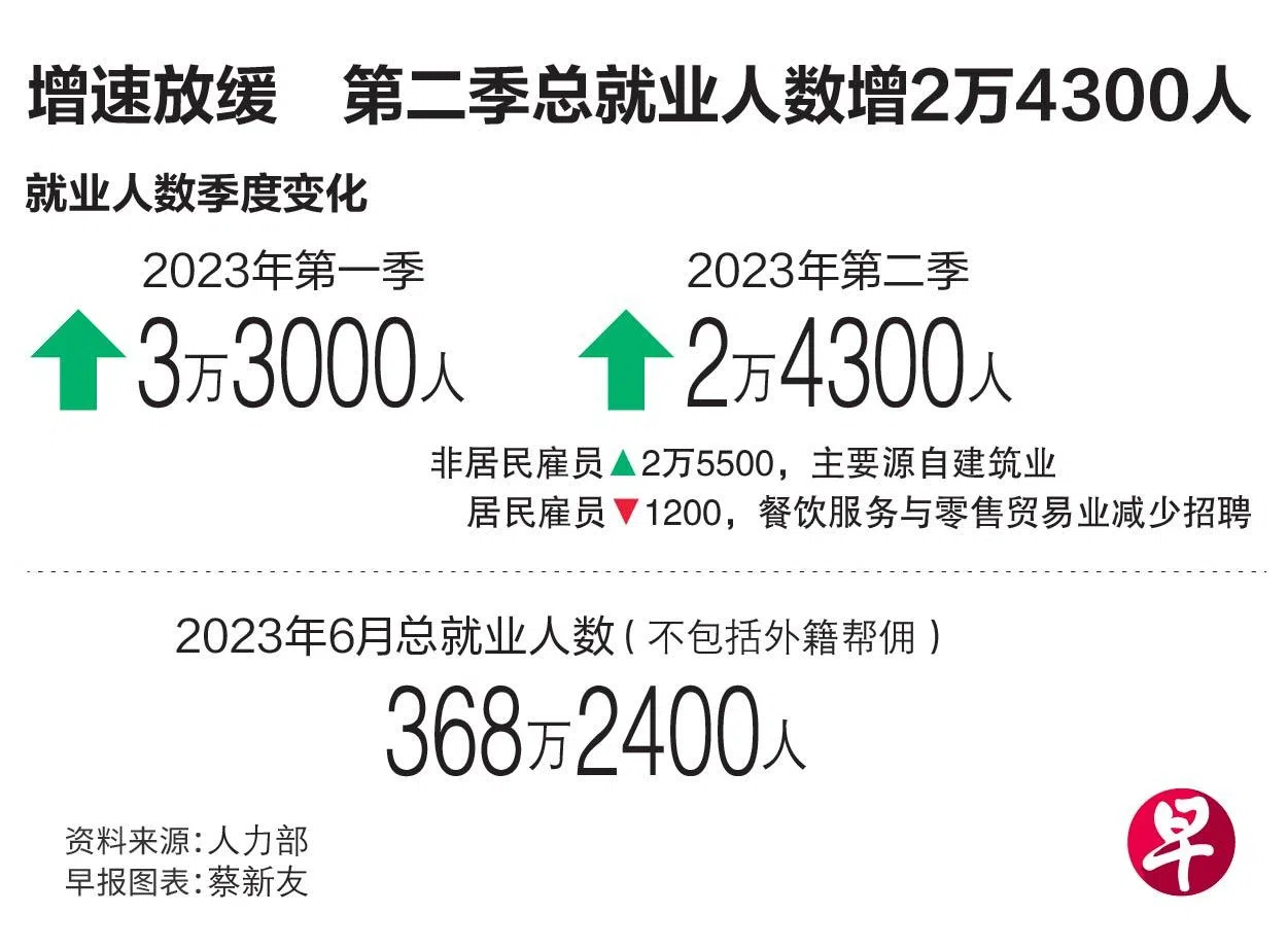 根据人力部星期四(9月14日)公布的今年第二季《劳动市场报告》,不包括外籍帮佣,第二季就业人口增加2万4300人,环比减少8700人。6月份的总就业人口达368万2400人 ,其中居民雇员人数为247万1000人。