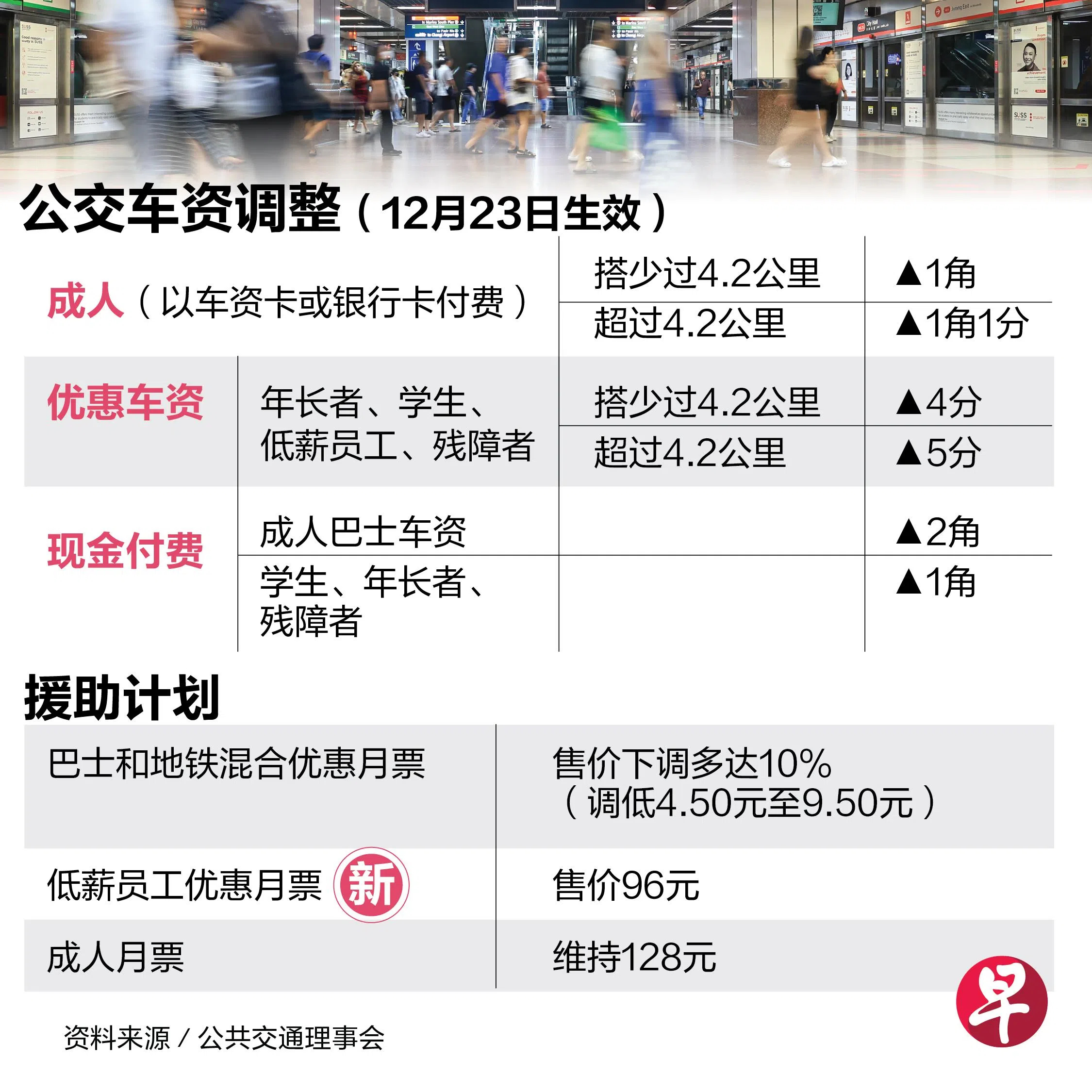 地铁和公共巴士车资将连续三年上调,从12月23日起,整体车资将调高7%。以车资卡或银行卡付费的成人车资,每趟车程上调1角至1角1分,视车程距离而定。