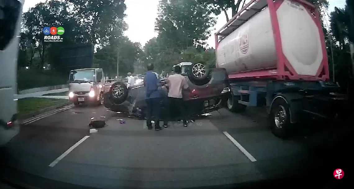 根据脸书专页(ROADS.SG)发布的视频,画面显示一辆黑色汽车在马路中央翻覆,满地汽车零件和碎片,场面触目惊心。
