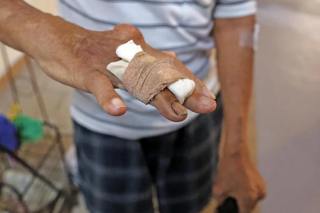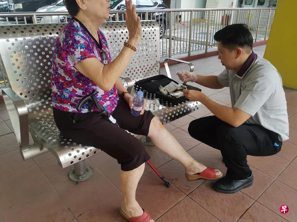 77岁阿嬷过马路时跌倒,巴士转换站好心员工扶她起来还帮忙擦药,路人大赞热心。