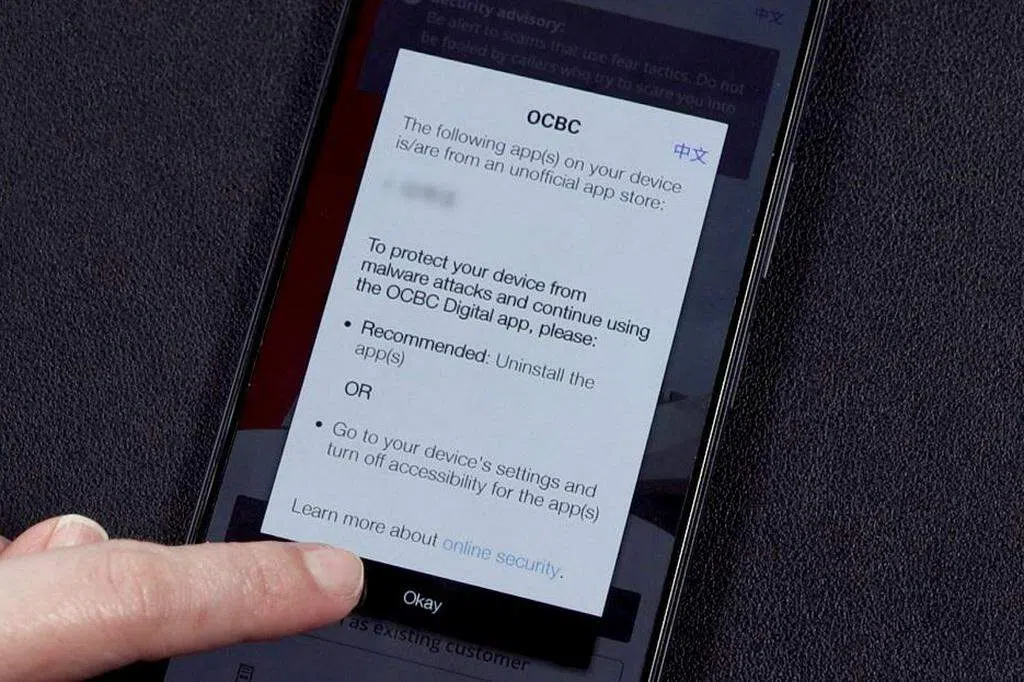 若客户手机内有第三方或非官方商店下载的应用,加上这些应用出现危险权限设置时,客户将暂时无法使用银行应用。此外,应用也会弹出一个通知,告知客户是哪一些应用导致他们暂时无法使用银行手机应用。“我们强烈建议客户删除这些手机应用。”