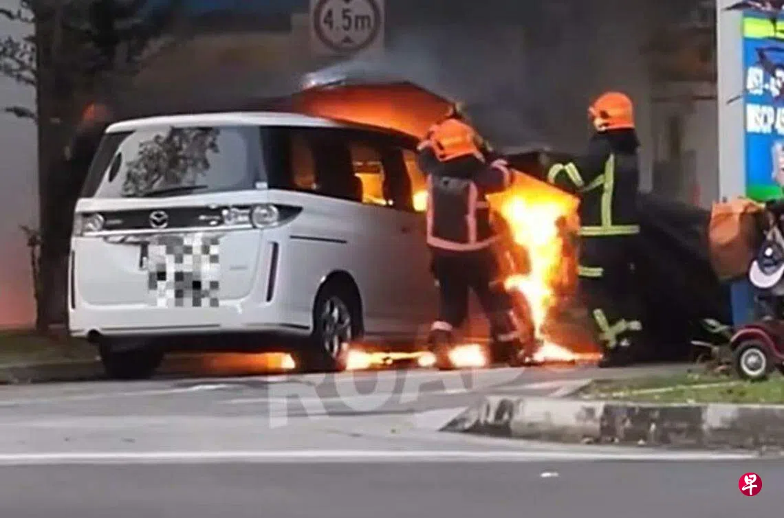 一辆多用途轿车在义顺组屋区失火狂烧,新加坡民防部队利用灭火毯扑灭火势,没有人在事故中受伤。