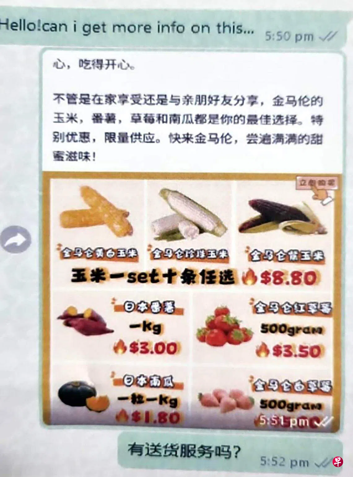警方指出,在这类型骗局中,受害者在脸书上看到推销白米、曲奇饼或鸭肉等食品的广告。受害者点击广告附上的链接后,就会被转至WhatsApp与“卖家”洽谈。