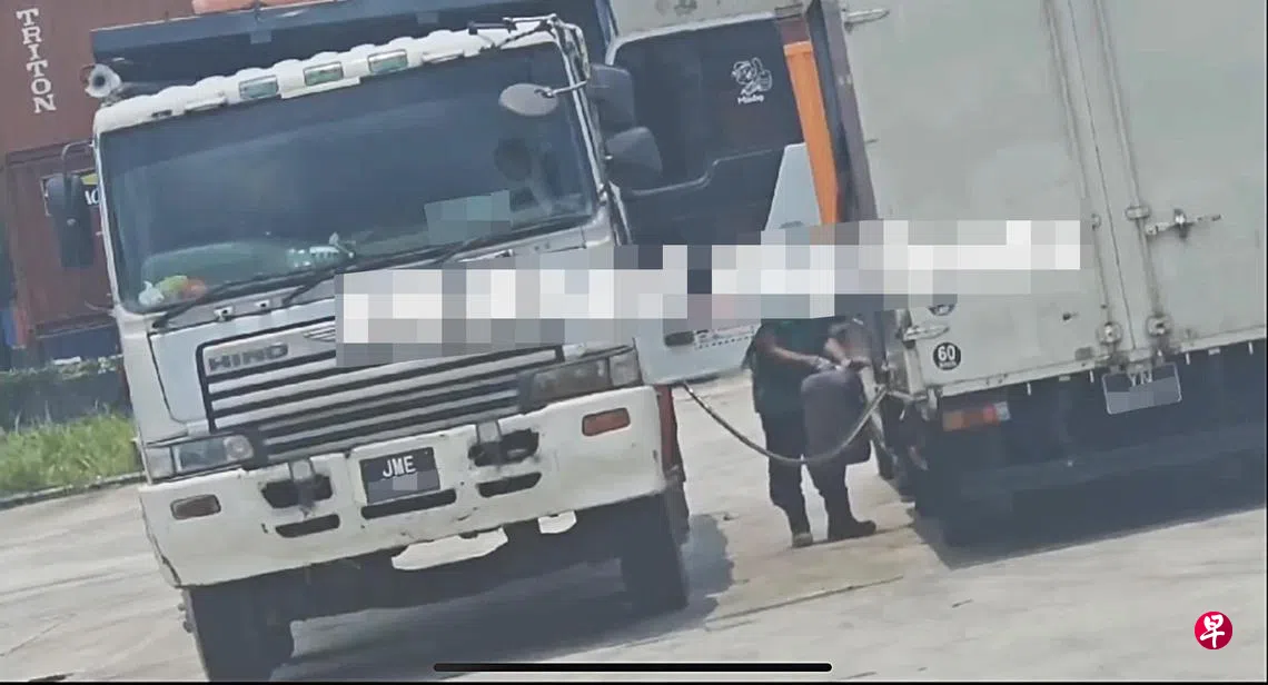 脸书页面SG Road Vigilante近日流传一则视频,称在裕廊一带第四振美路一个露天重型车辆停车场内,有一辆马来西亚注册的油槽车正在为其他重型车辆供应柴油。