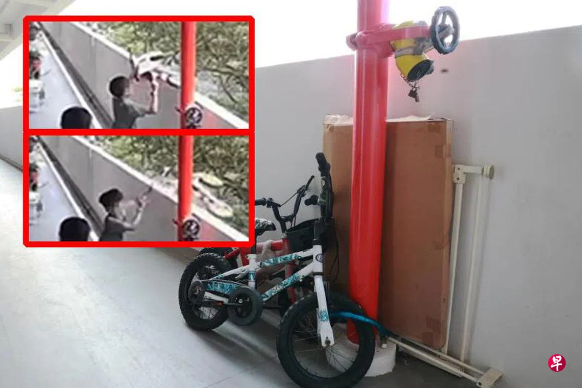 豹子胆!两名顽童高楼抛物,从走廊往下丢石头,甚至还把一辆脚踏车扔下楼。