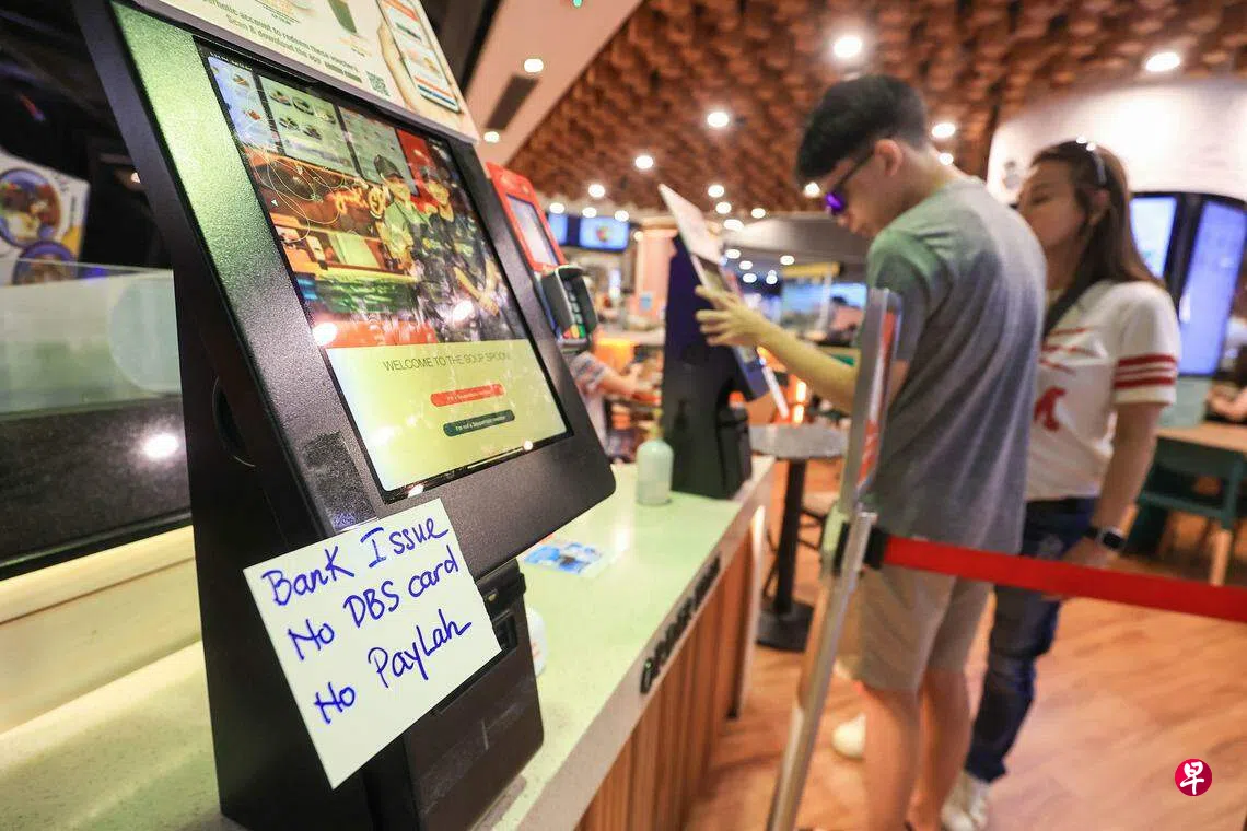 《联合早报》记者下午走访多处,注意到多家职总平价超市在结账柜台前,张贴告示,提醒消费者暂时无法使用星展银行和储蓄银行信用卡和NETS付款。也有读者向记者反映,无法使用提款卡取款,只能到分行柜台领取现金。