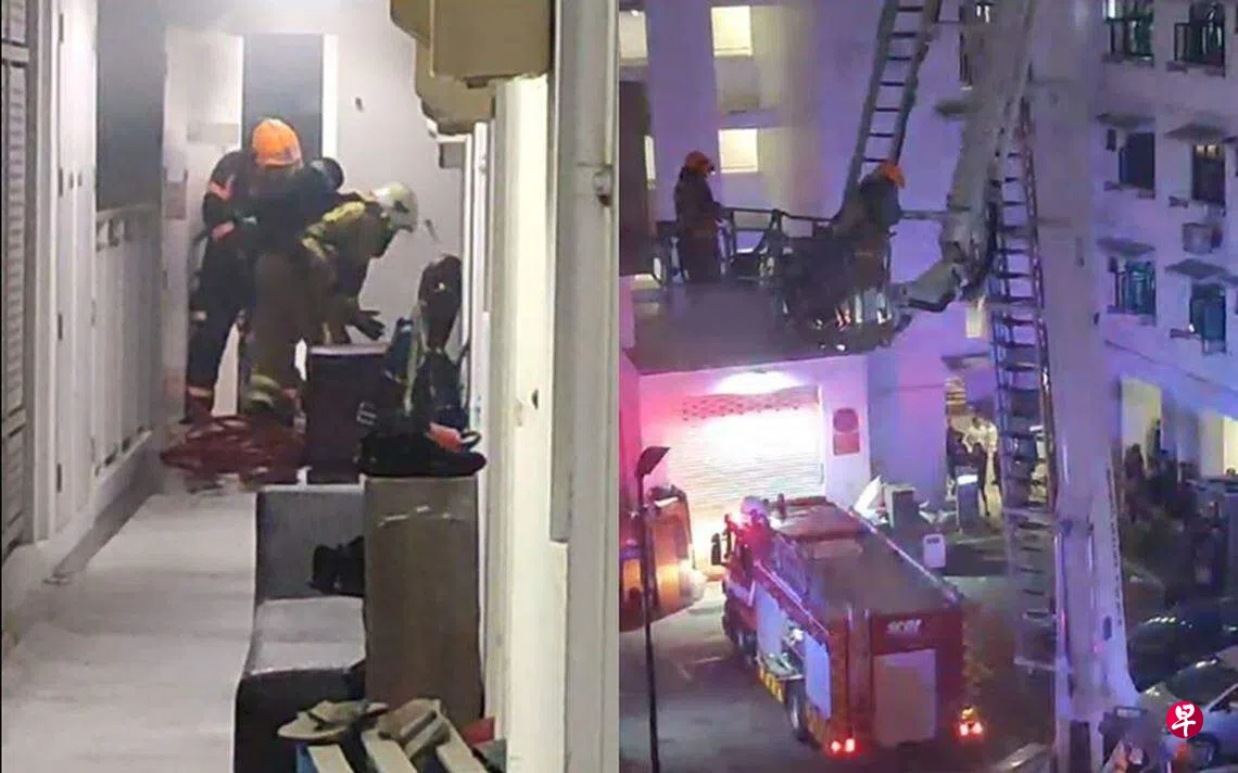 淡滨尼一组屋单位发生火患,正在客厅充电的两辆个人代步工具电池起火,屋内三人情急之下爬出窗外,站在窗沿上求救,民防到场后破门救人。