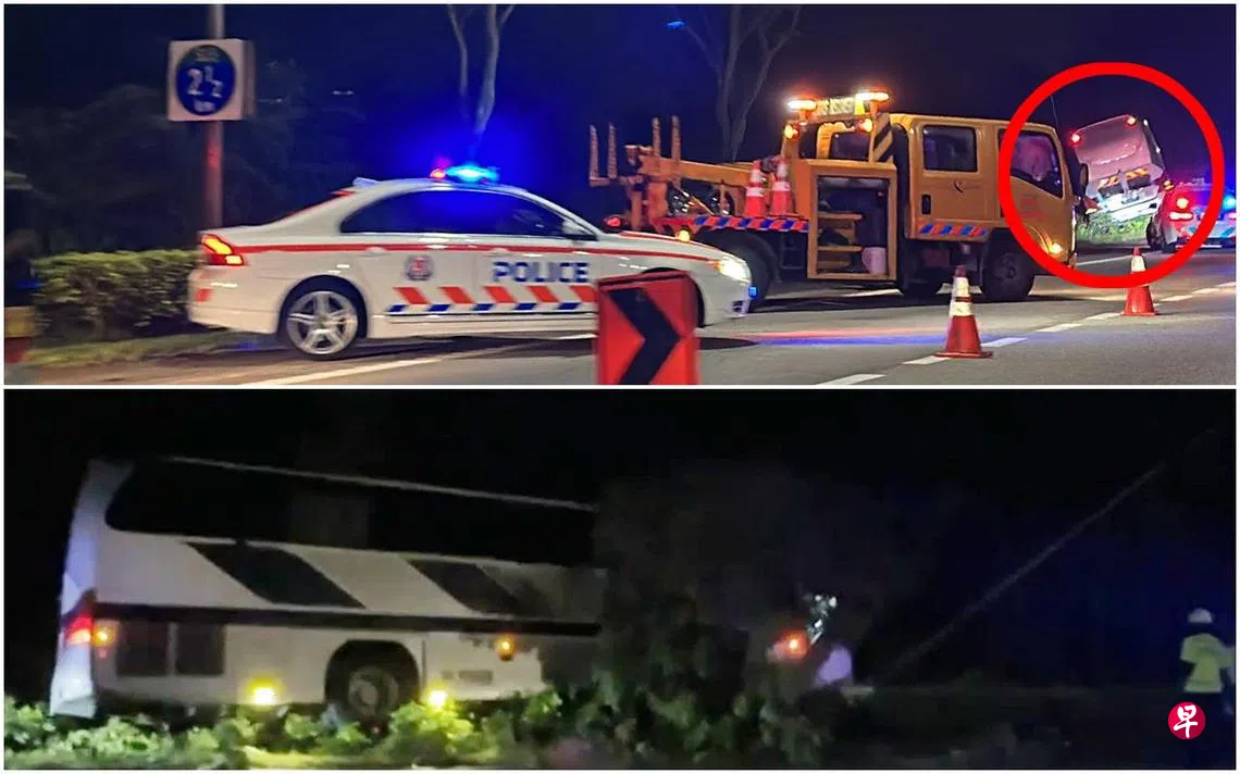 一辆巴士星期四(10月19日)凌晨在实里达西连路(Seletar West Link)出口前的路段出车祸,冲入草坪撞树,最后还得出动吊车“救”出来。