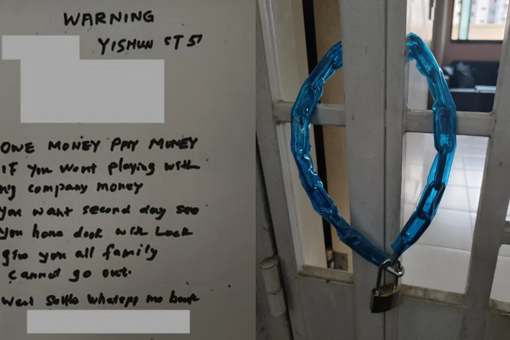 新加坡警察部队星期五(10月20日)发文告说,警方星期四(19日)傍晚约6时35分接获报案,指马西岭坡的住宅单位发生大耳窿骚扰案,受害者的单位大门遭人泼洒相信是松节油(turpentine)的液体,一旁的鞋架留下一张讨债字条。
