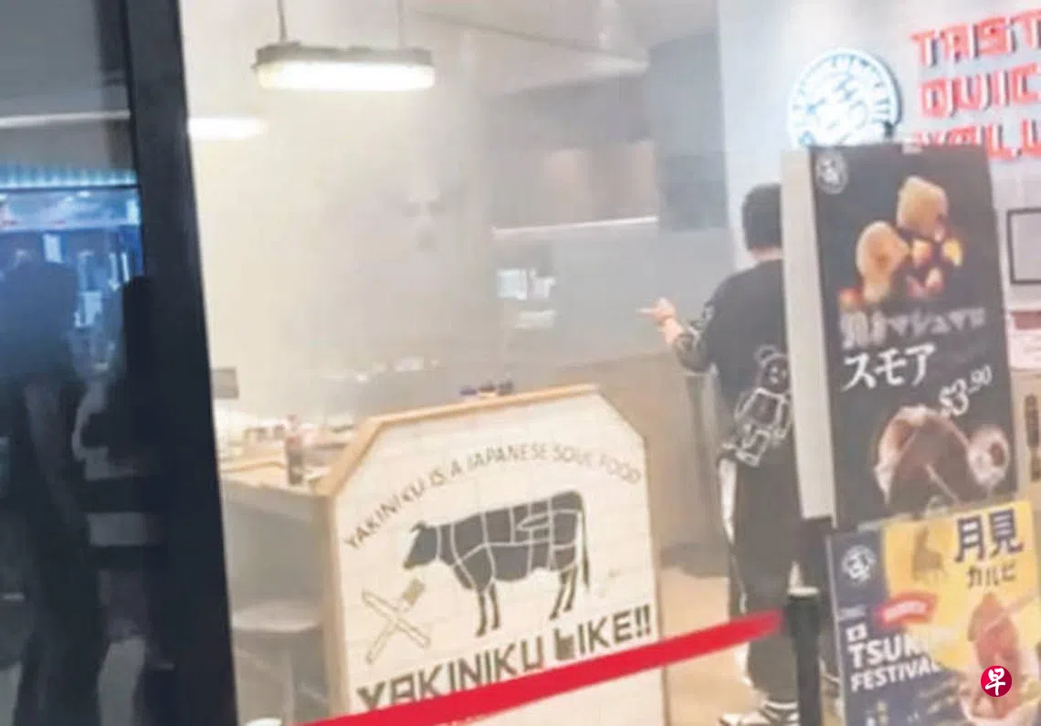 怡丰城和盛港的同一家烤肉连锁店分店,烤架起火冒出滚滚浓烟,食客纷纷疏散逃离。