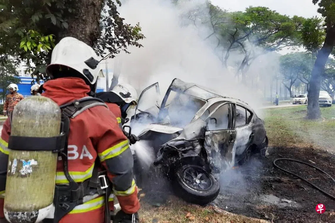 狮城男子在马来西亚新山开车时出意外,车子撞树狂烧,疑来不及逃生,活活烧成焦尸。