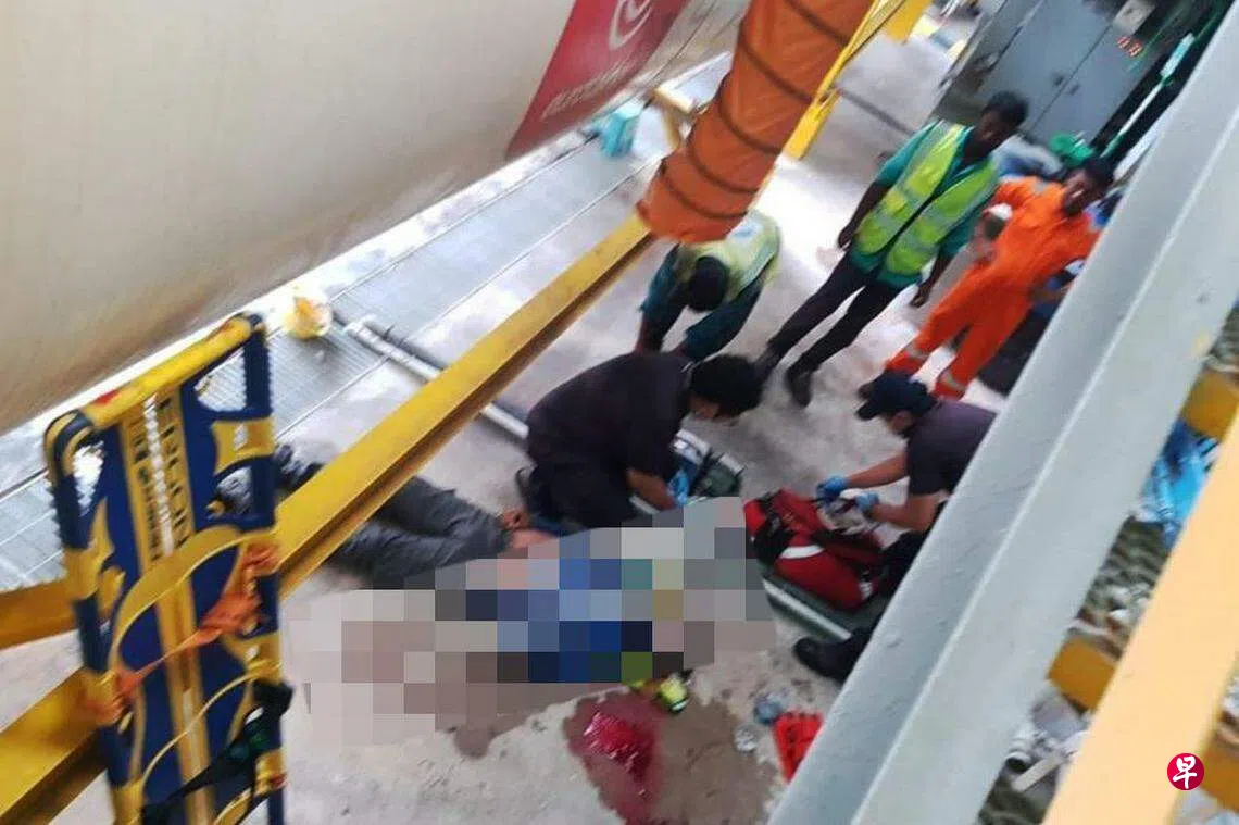 根据网络上流传的照片,跌落的客工面部朝上平躺在地,头部流了很多血,两名民防人员对他进行急救,几名客工在旁帮忙。