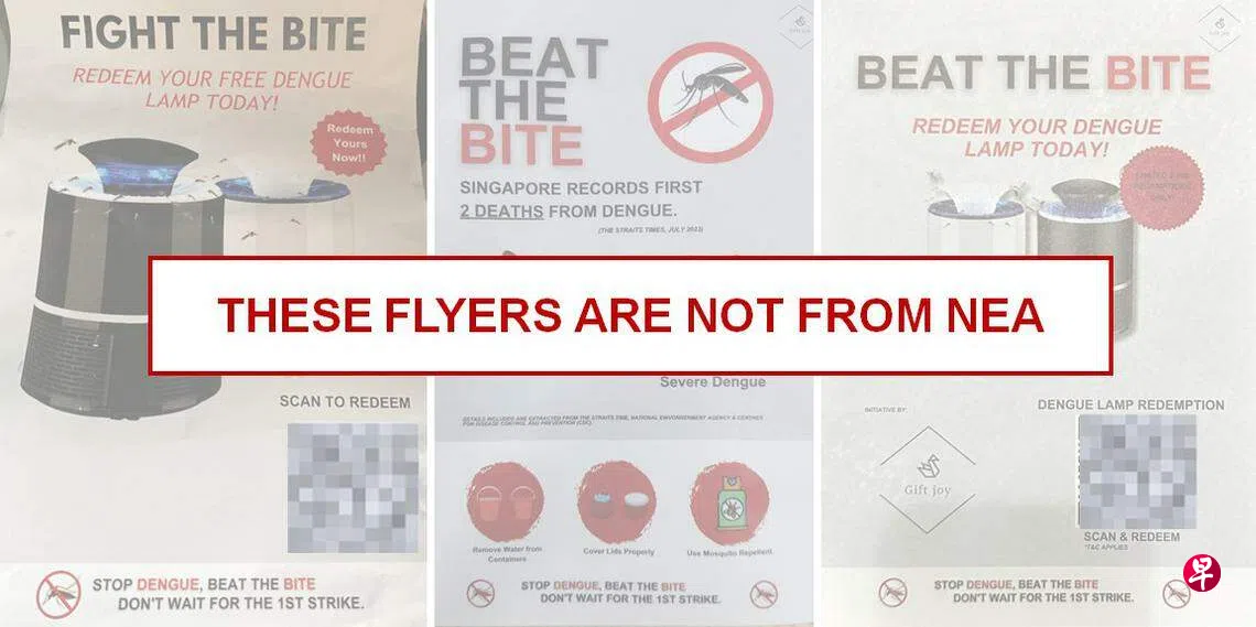 不少居民收到免费兑换灭蚊灯传单,国家环境局再次提醒,这些传单并不出自环境局,公众也不应扫描来历不明材料印有的QR码或下载网站链接。